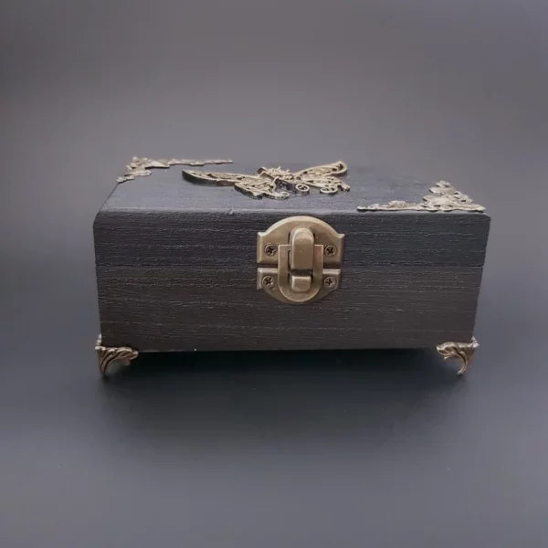 Le contraste noir et doré ancien de cette boîte fait ressortir le papillon central ainsi que les décoration d’angle, jusqu’aux petits pieds qui la soutienne.