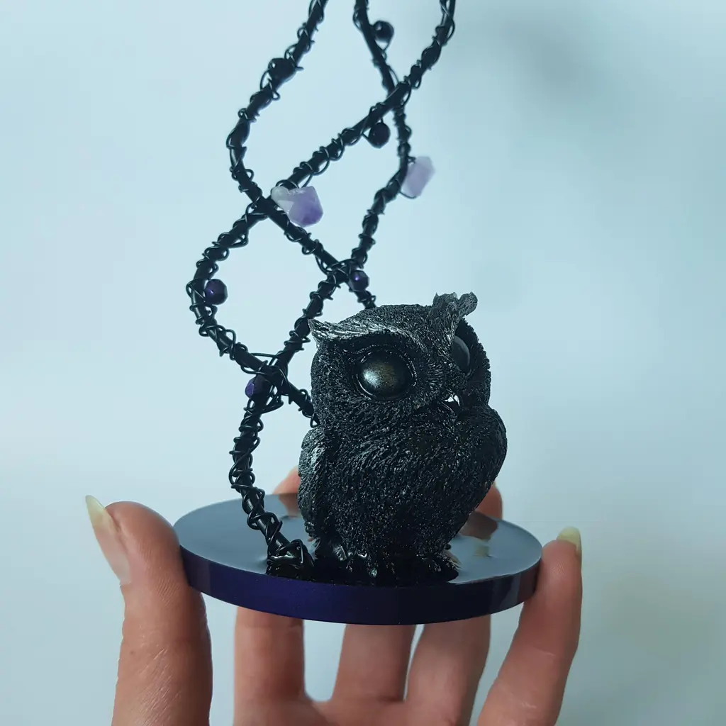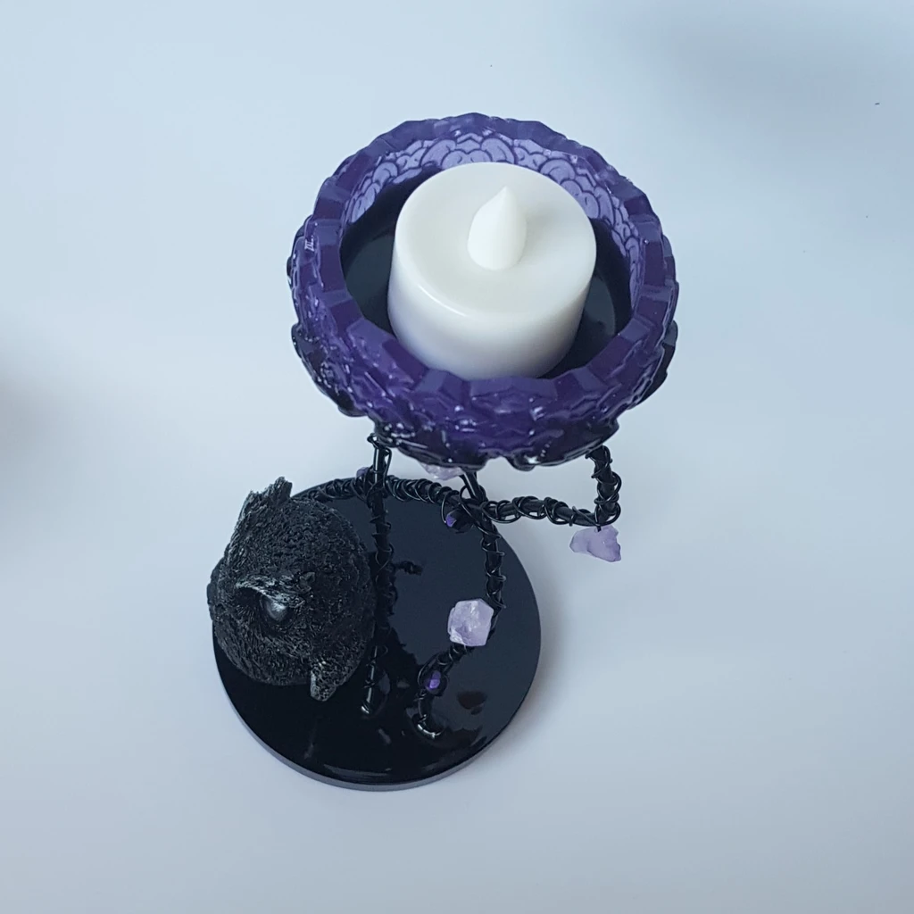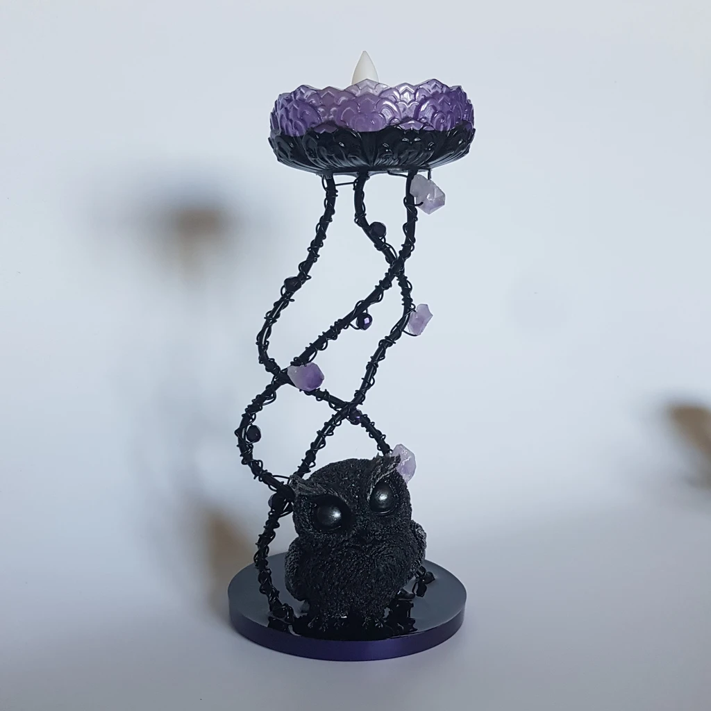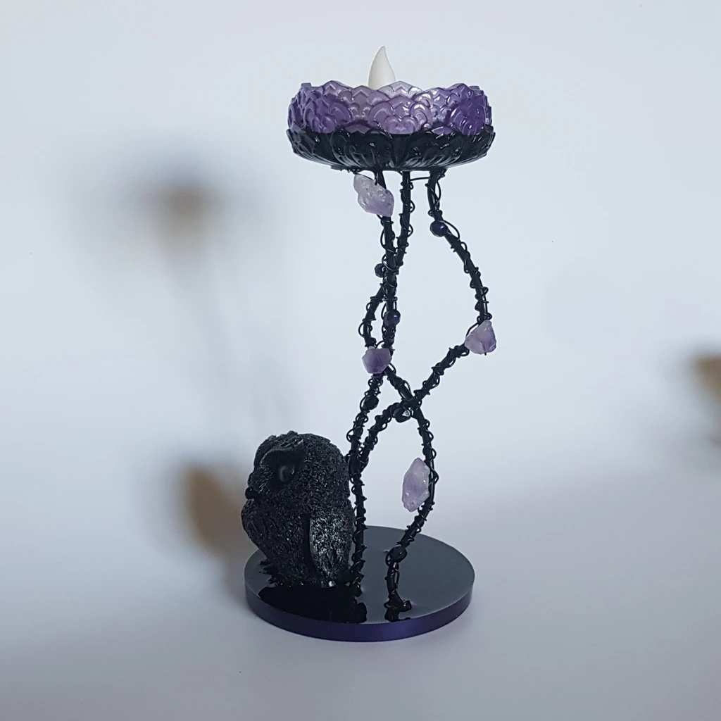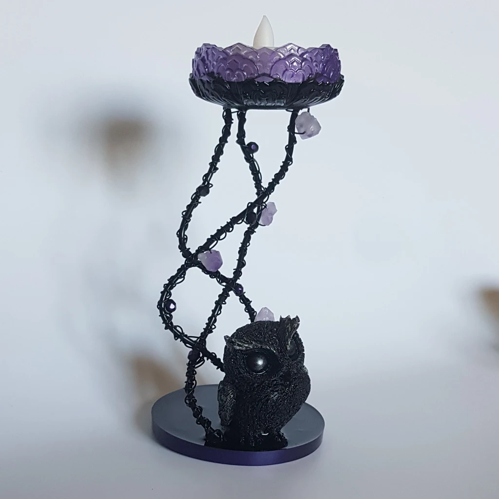 Avec sa touche fantasy, cet adorable bougeoir petit hibou et améthyste sera du plus bel effet pour une décoration d’autel de sorcière ou tout autre endroit de votre choix!